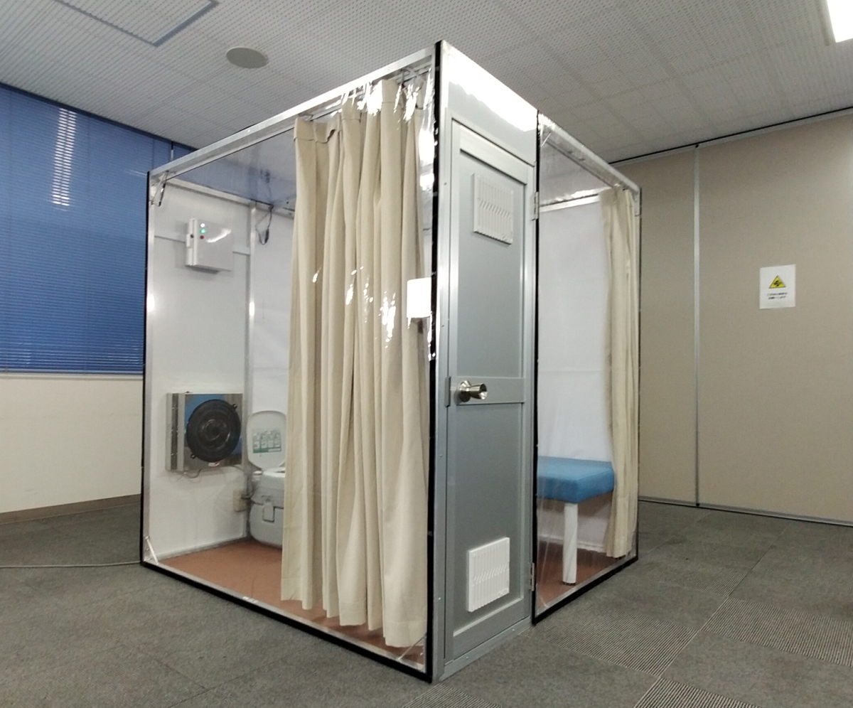 当社が今まで培ってきた組立て式オリジナル什器製造の技術を使い、新たな取り組みとして避難場所のプライベート空間、医療現場での隔離室の確保などのニーズに応える商品として、組立て簡単「多目的隔離室」を開発しました。